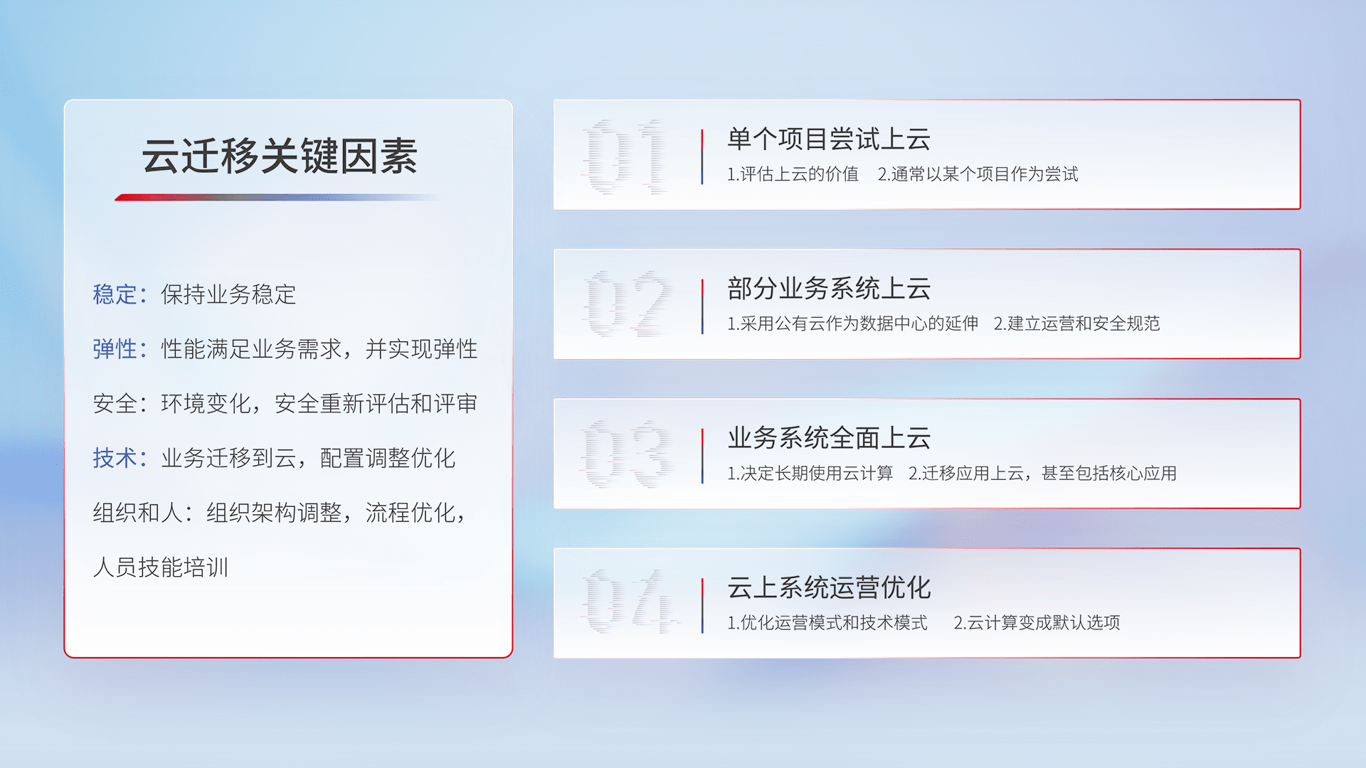 结合实际业务,,,,从规划设计、、、云平台选型、、、、云原生改造、、数据迁移、、、、集成交付,,,,迁移全过程为客户识别最佳上云路径,,,,做好风险识别管理,,,,设计网络架构、、身份权限、、安全审计合规、、、操作审计、、、、日志审计、、、监控告警策略、、多站点容灾设计等,,对云上基础设施进行整体规划,,,提升IT治理水平,,,以满足弹性、、高可用、、、高性能的需求。。。