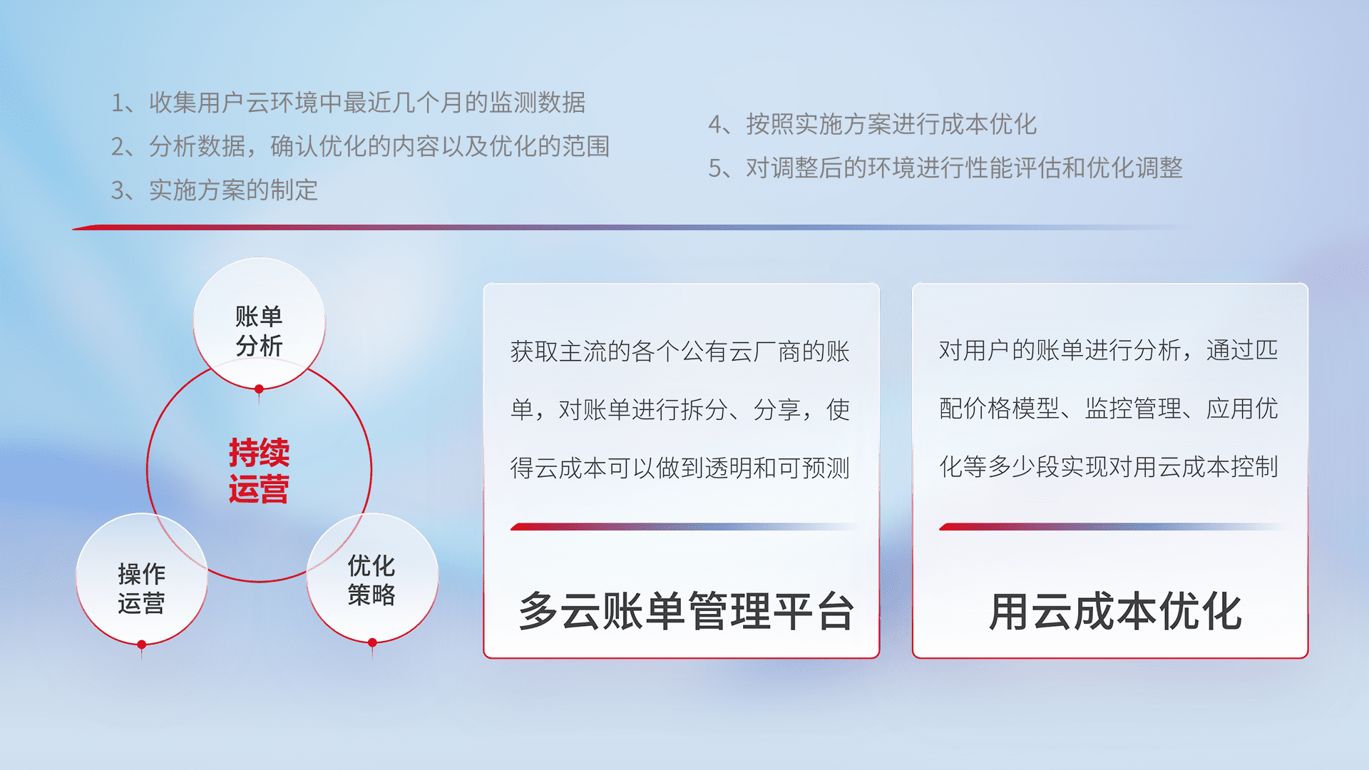 通过多云纳管,,,,以统一的资源数据模型把客户的云资源进行抽象和封装,,,,进而实现对多云资源的统一操作,,,,保障云资源管理的可靠性、、、、稳定性与可用性。。。量身定制化运维内容,,,,配置、、开发运维、、补丁管理、、、备份、、监控、、认证和访问管理、、、、审计和日常巡检等,,,保障在用云过程中的可靠度,,,稳定度以及高可用率。。
